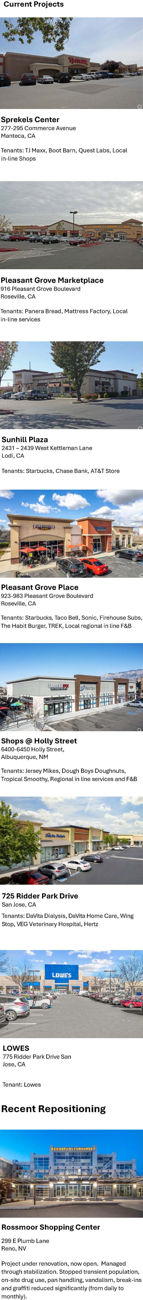 Properties the team has managed include: 600 California Street in San Francisco, California, Plaza in Walnut Creek, 1 Broward Tower in Fort Lauderdale, Northwestern Mutual’s 1.5M SF Pacific Business Park in Henderson Nevada and the 2M SF Reno Sparks Industrial Park to prominent shopping centers and high street retail properties from Brooklyn to Santa Monica.